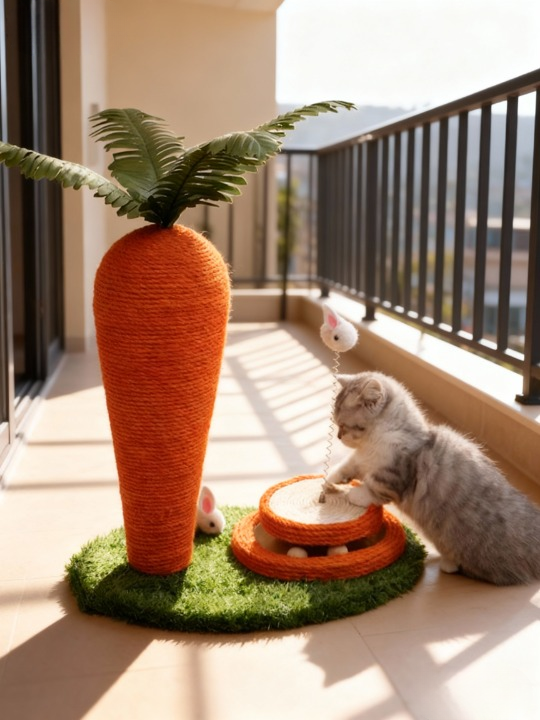 |Cute carrot-shaped cat scratching post with play platform. Made from durable sisal rope, includes interactive hanging toys and a stable grass base. Helps protect furniture while keeping cats active and entertained.