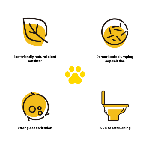 Cassava litter mixed with tofu cat litter to fill gaps, the two types of particles strongly absorb and lock unpleasant odors to prevent its spread. And prevents litter tracking out.